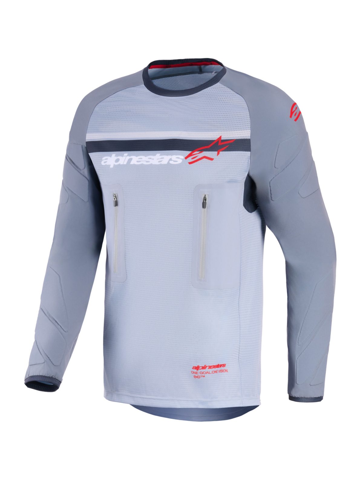 • Praktické kapsy na zip integorvané na hrudi zajišťují čistý design a umožňují odložení nezbytností jako doklady atd. . Ideální kombinace nošení dresu přes celotělový protektor nebo v kombinaci s batohem.