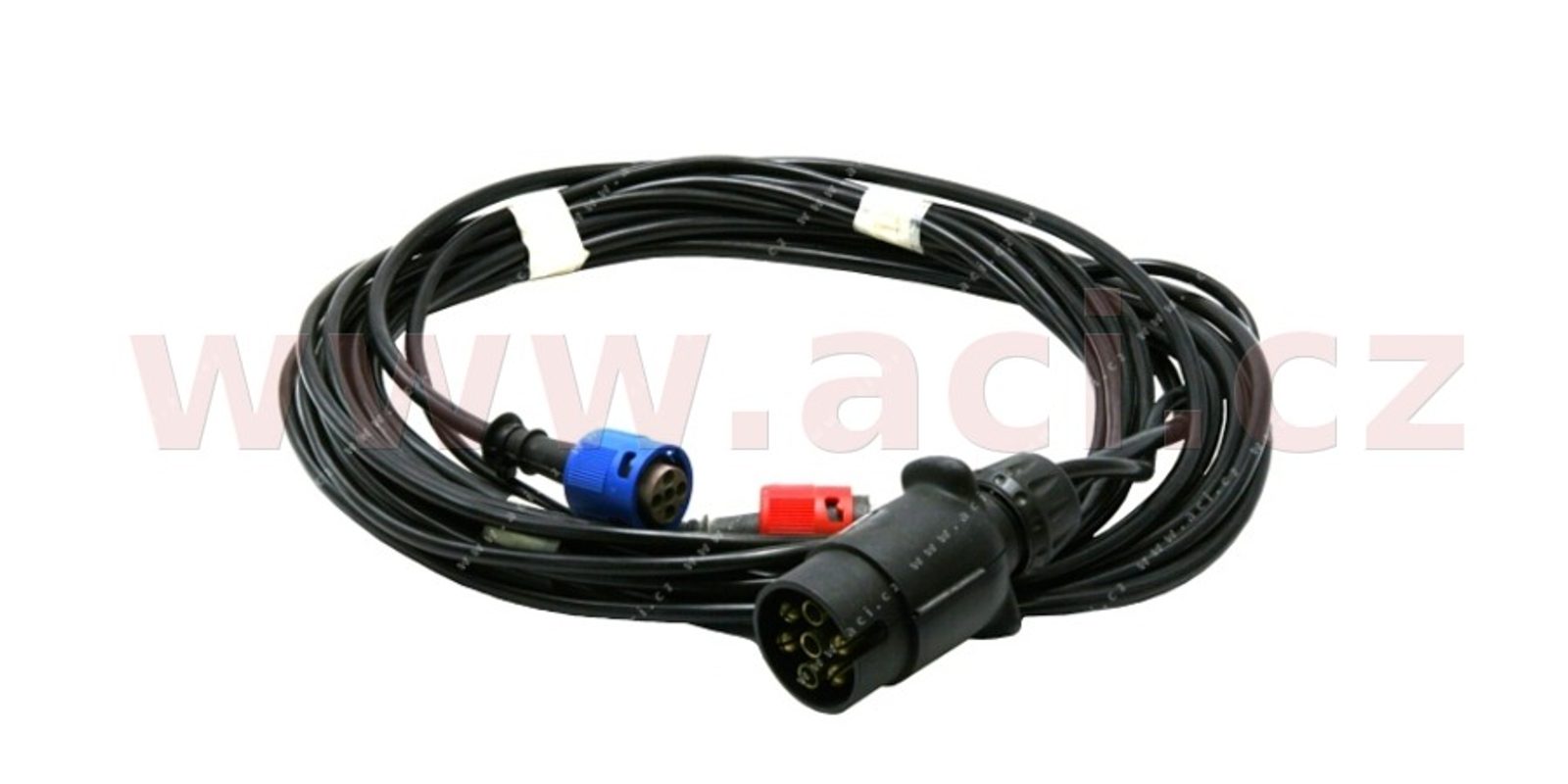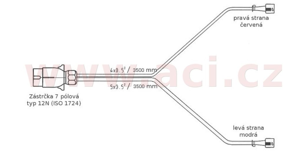 - Ze sedmipólové zástrčky jsou vyvedeny dvě větve kabelů 5x0,5 mm² a 4x0,5 mm² (levá a pravá) o délce 3500 mm.