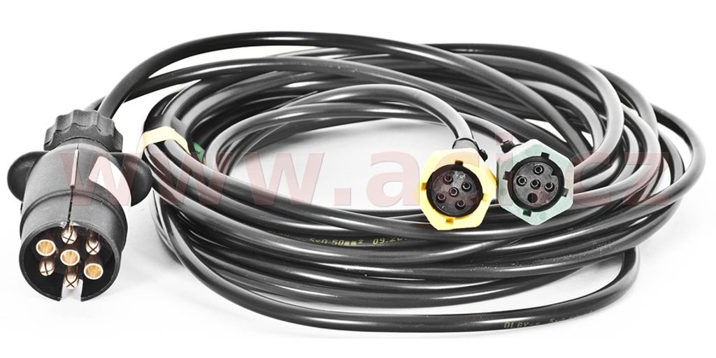 - Ze sedmipólové zástrčky jsou vyvedeny dvě větve kabelů 5x0,5 mm² a 4x0,5 mm² (levá a pravá) o délce 4550 mm.
