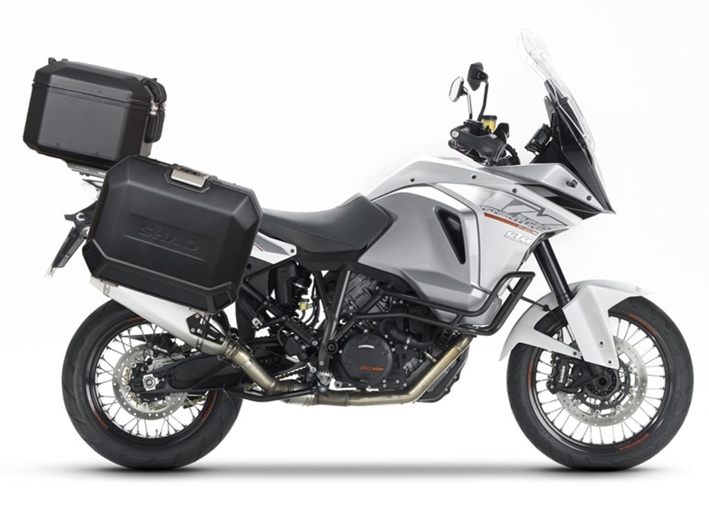Kompletná sada bočných čiernych hliníkových kufrov SHAD TERRA BLACK, 36/47 l litrov, vrátane montážnej sady SHAD KTM Adventure 1090, 1190, Super Adventure 1290 (R, S)
