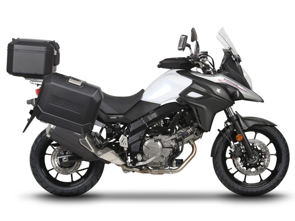 Kompletná sada čiernych hliníkových kufrov SHAD TERRA BLACK, 37 litrov vrchný kufor, 36/36 litrov bočné kufre, vrátane montážnej sady a platni SHAD SUZUKI DL 650 V-Strom
