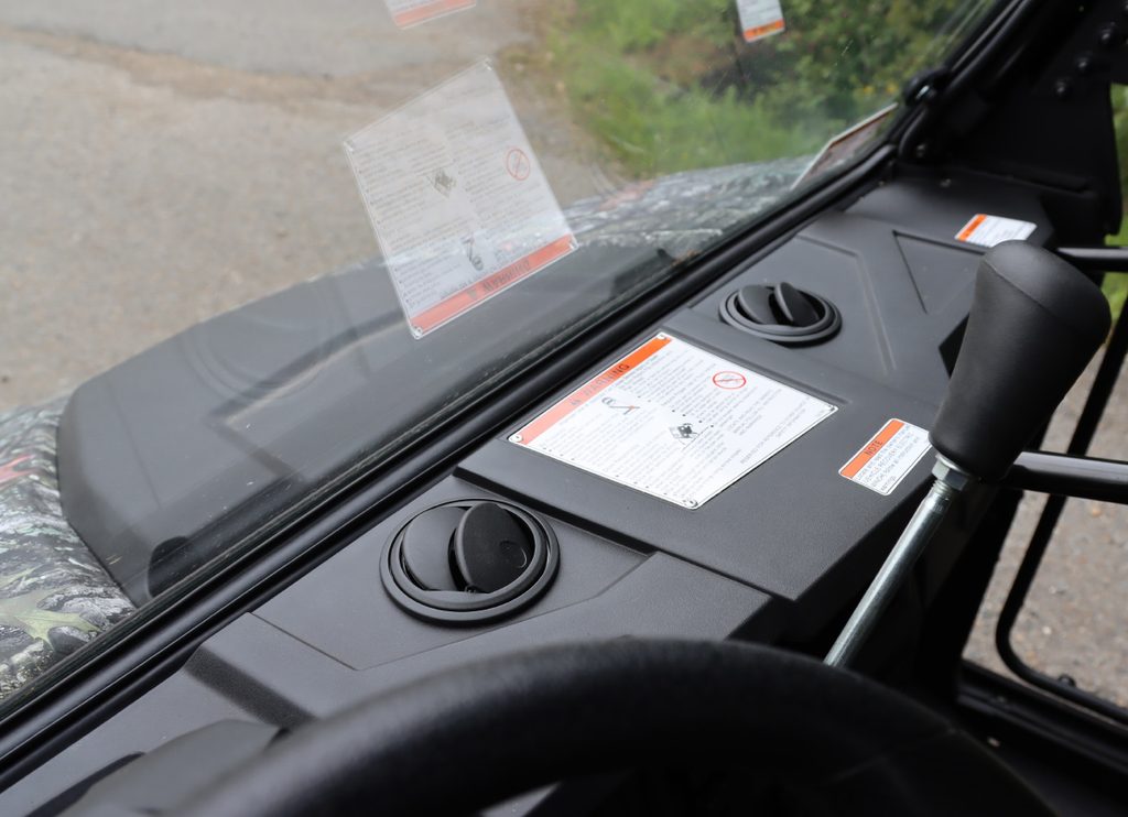 Vyhřívaná kabina pro UTV Linhai 520/550/570/650 T-BOSS, čiré polykarbonátové dveře, uzamykatelné, o 180° otevíratelné, s posuvnými okny, přední okno z bezpečnostního skla se stěračem a ostřikovačem, zadní čelo z čirého tvrzeného UV-odolného polykarbonátu, teplovodní topení