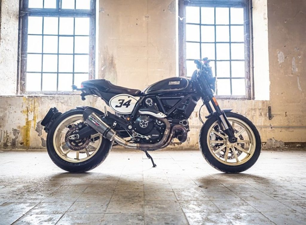 Tlumič výfuku má kuželovitý tvar se speciální geometrií, která začíná průměrem 90 mm a rozšiřuje se až na 130 mm v obvodu; jeho délka se liší podle typu motocyklu. Má tělo z nerezové oceli s povrchovou úpravou imitující karbon, nerezové koncovky vyrobené CNC obráběním a pětiúhelníkový výstup s dB killerem. Kulatý kuželový tvar má rozměry 390 × 130 mm.