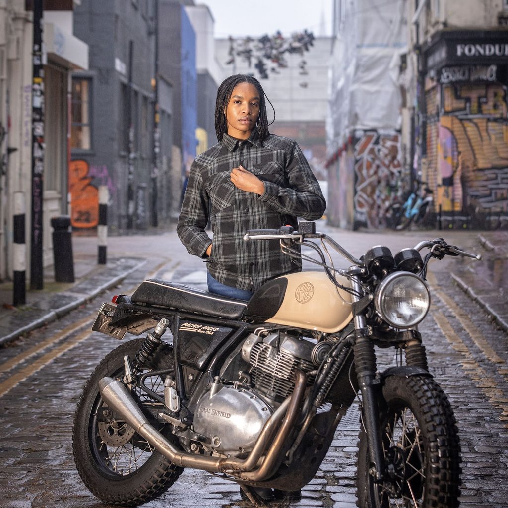 Stylová moto-košile s technickým duchem – navržena tak, aby vypadala jako běžná košile, ale nabízela zabezpečení a pohodlí při jízdě.