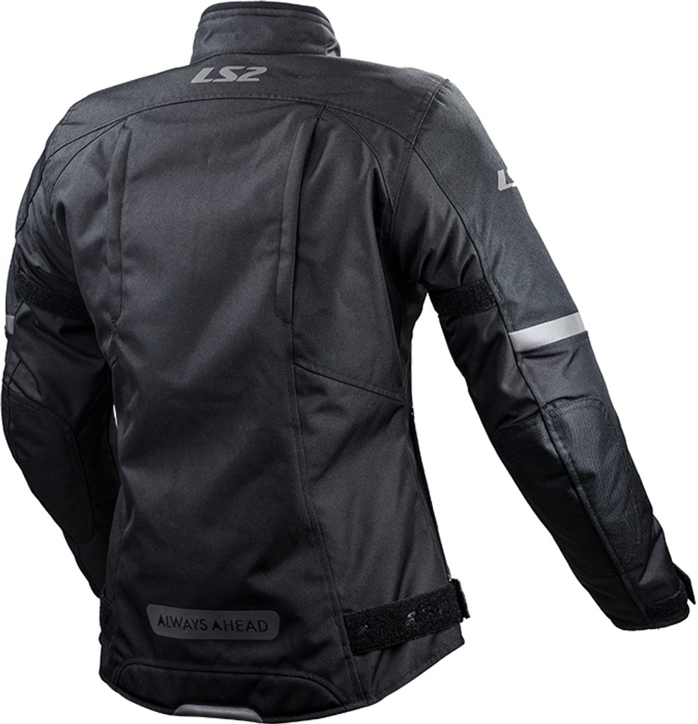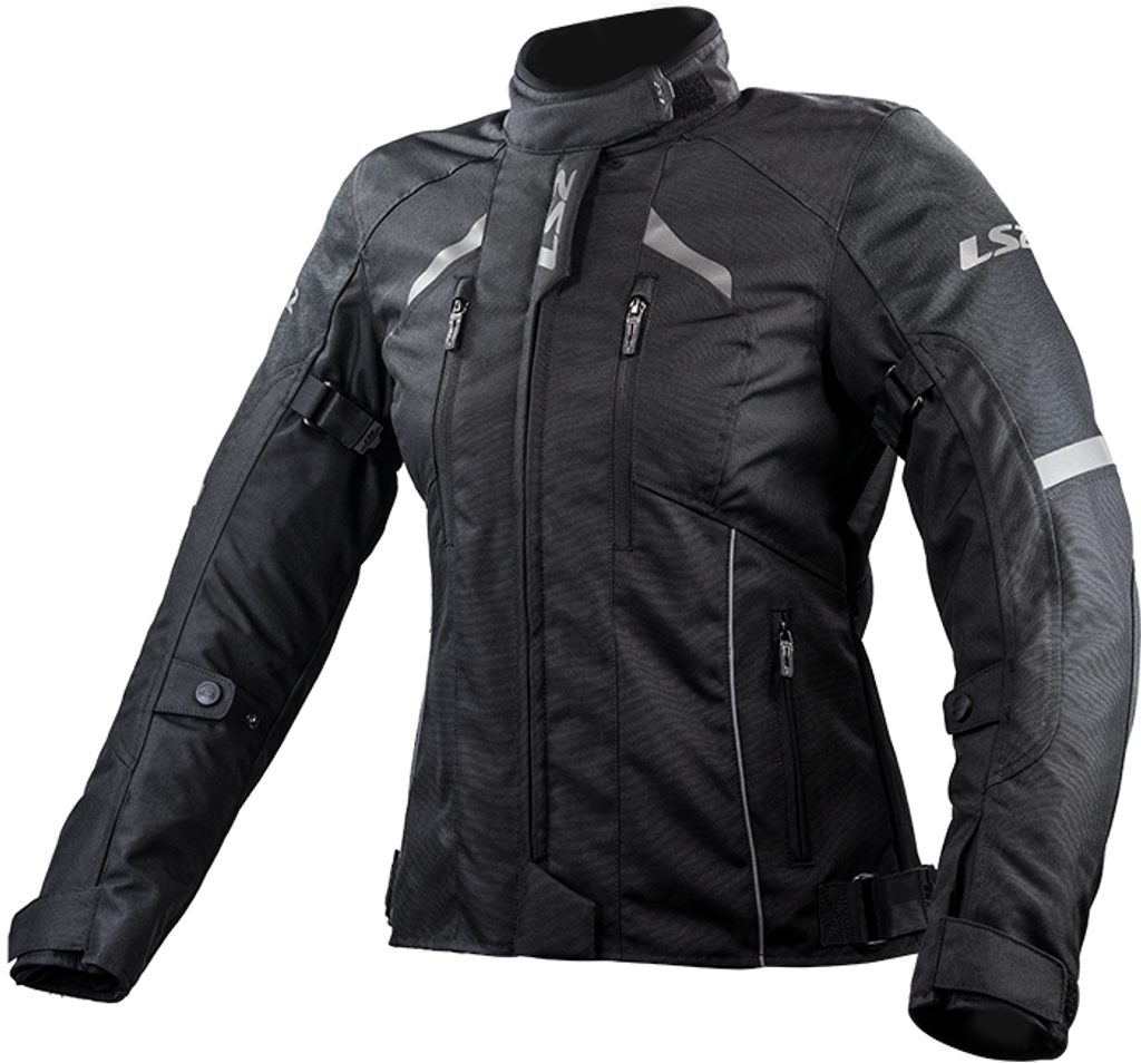 Dámská moto bunda do každého počasí s nepromokavou prodyšnou membránou, vyjímatelná termovložka, CE certifikované chrániče, přední a zadní větrací zipy, zip pro spojení bundy s kalhotami, vyjímatelné chrániče loktů a ramen s CE certifikací, kapsa na chránič zad