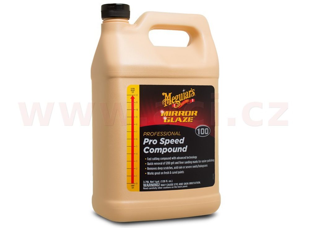 M100 Pro Speed Compound je nejúčinnější profesionální leštěnka Meguiar's. Je ideální pro použití jako první krok po broušení laku (sandingu), nebo pro silně poškozené laky. Po přeleštění povrchu je důrazně doporučeno povrch doleštit finišovací leštěnkou M205 Ultra Finishing Polish.