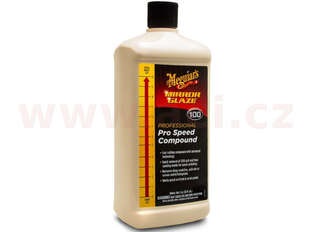 M100 Pro Speed Compound je nejúčinnější profesionální leštěnka Meguiar's. Je ideální pro použití jako první krok po broušení laku (sandingu), nebo pro silně poškozené laky. Po přeleštění povrchu je důrazně doporučeno povrch doleštit finišovací leštěnkou M205 Ultra Finishing Polish.