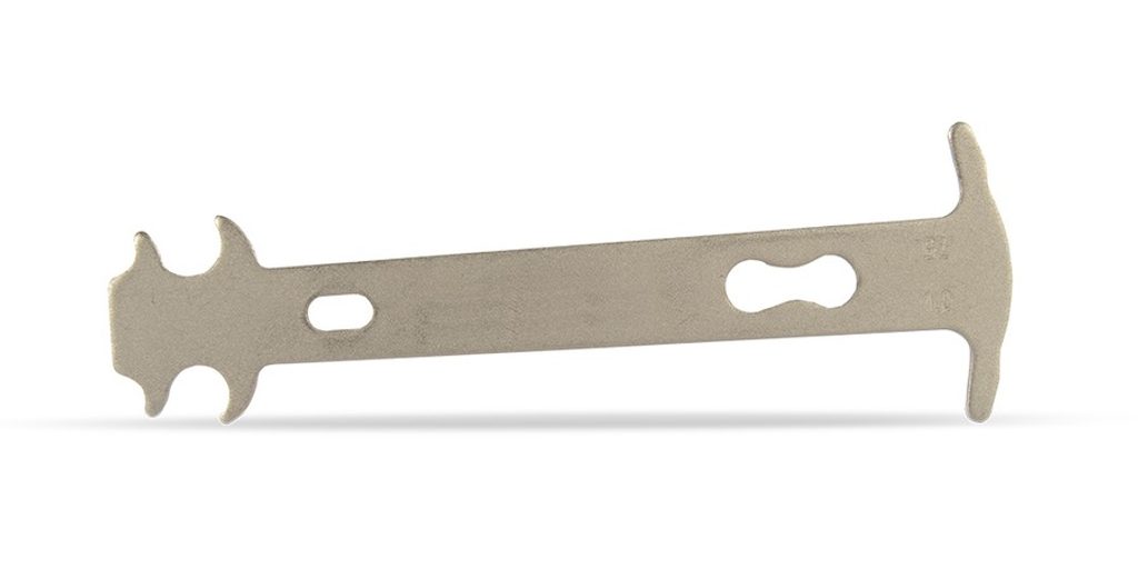 Měrka s ukazatelem dvou stupňů opotřebení (0,5 % a 0,75 %) protažení řetězu oproti novému.
