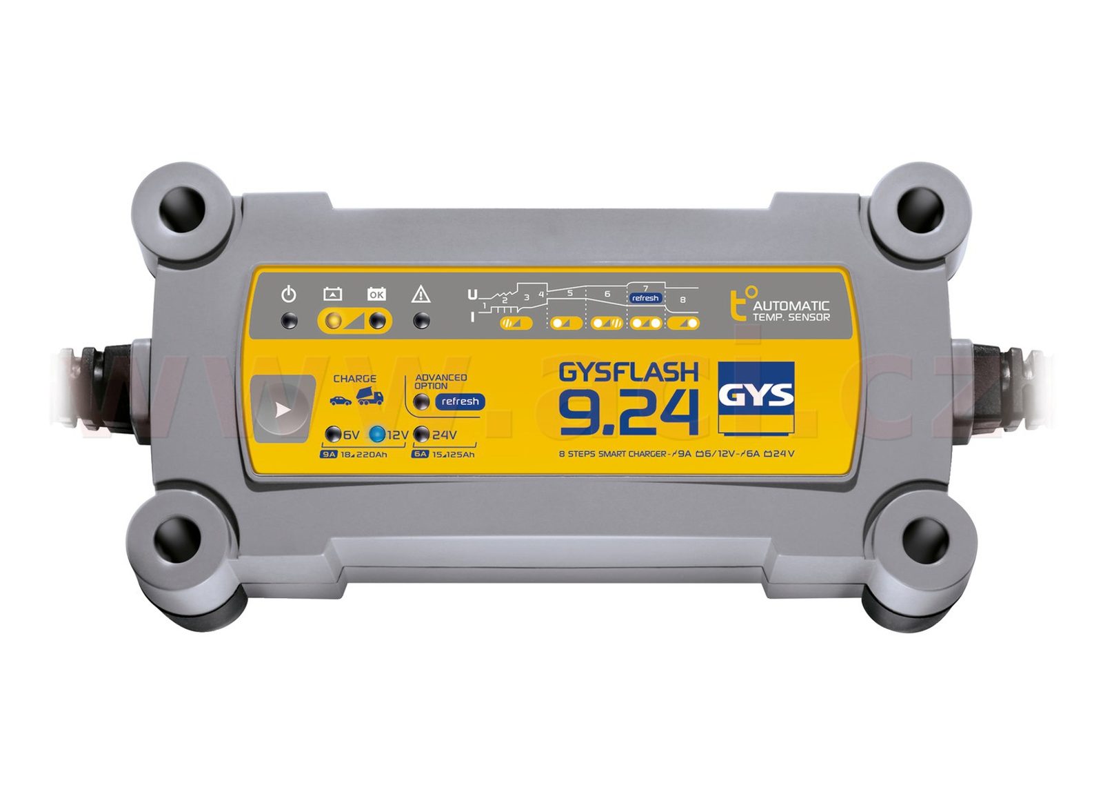 GYSFLASH 9.24 je speciálně navržena tak, aby nabíjela všechny typy baterií 6, 12 a 24 V pro všechny typy vozidel. Nabízí 8-krokovou inteligentní křívku pro optimální nabíjení a režim "Refresh" pro hluboce vybité baterie.