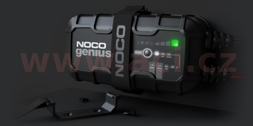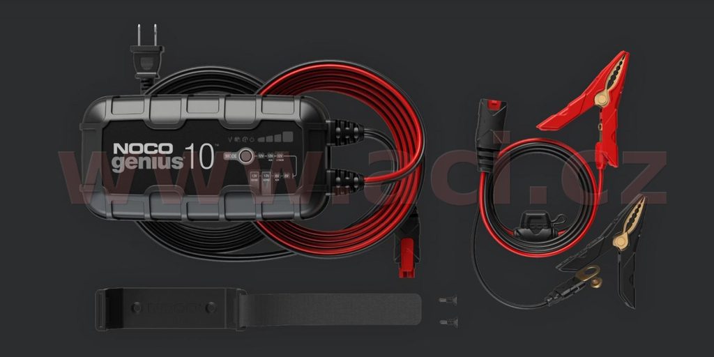 Inteligentní automatická nabíječka NOCO genius 10 6/12 V s maximálním nabíjecím proudem 10 A. Vhodná pro baterie o kapacitě do 230 Ah včetně lithiových baterií LiFEPO4.