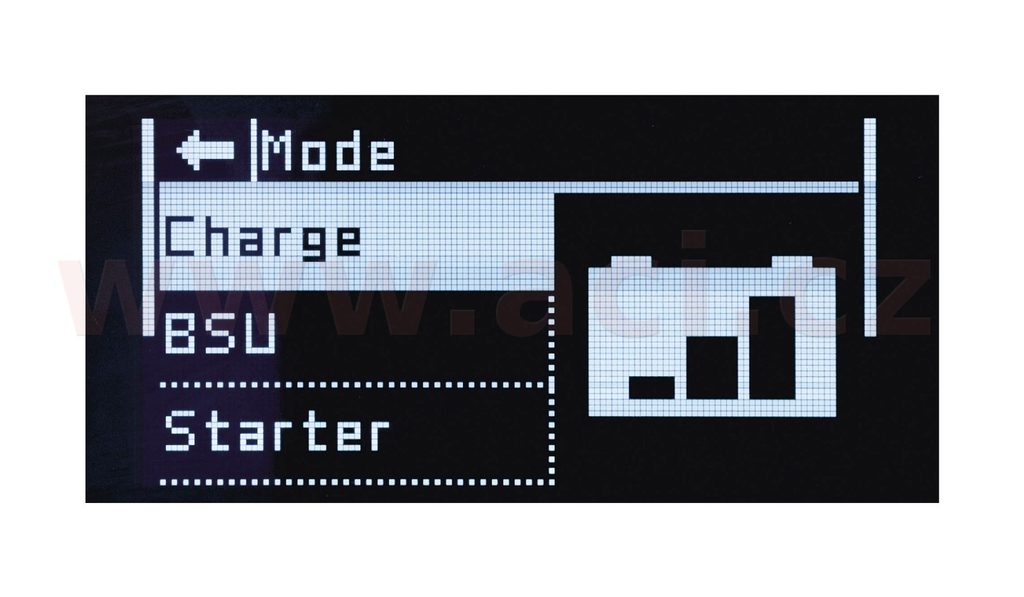 - Režim nabíjení: určen pro nabíjení olověných (uzavřených, kapalinových a AGM atd.) nebo lithiových (LiFePO4) startovacích akumulátorů.