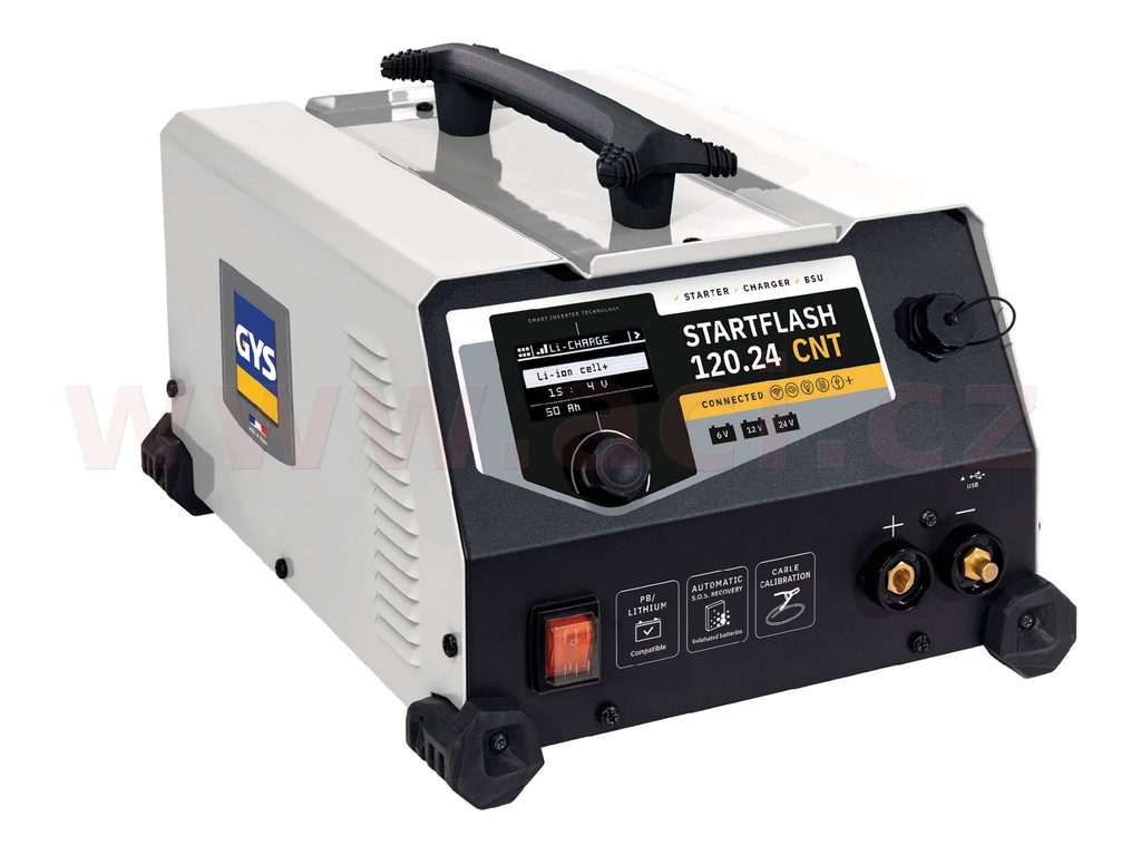 STARTFLASH 120.24 CNT je první nabíječka se startovacím zdrojem s invertorovou technologií. S vysokým jmenovitým výkonem 120 A je určena pro všechny 6, 12 nebo 24 V olověné i lithiové akumulátory. Během diagnostických prací udržuje dokonale stabilizované napětí baterie a zaručuje optimální kvalitu nabíjení pro údržbu nejmodernějších baterií. Je schopna nastartovat jakékoliv vozidlo, od lehkých až po těžké nákladní, a lze jí plně přizpůsobit díky pokročilému systému připojení (USB + SMC).