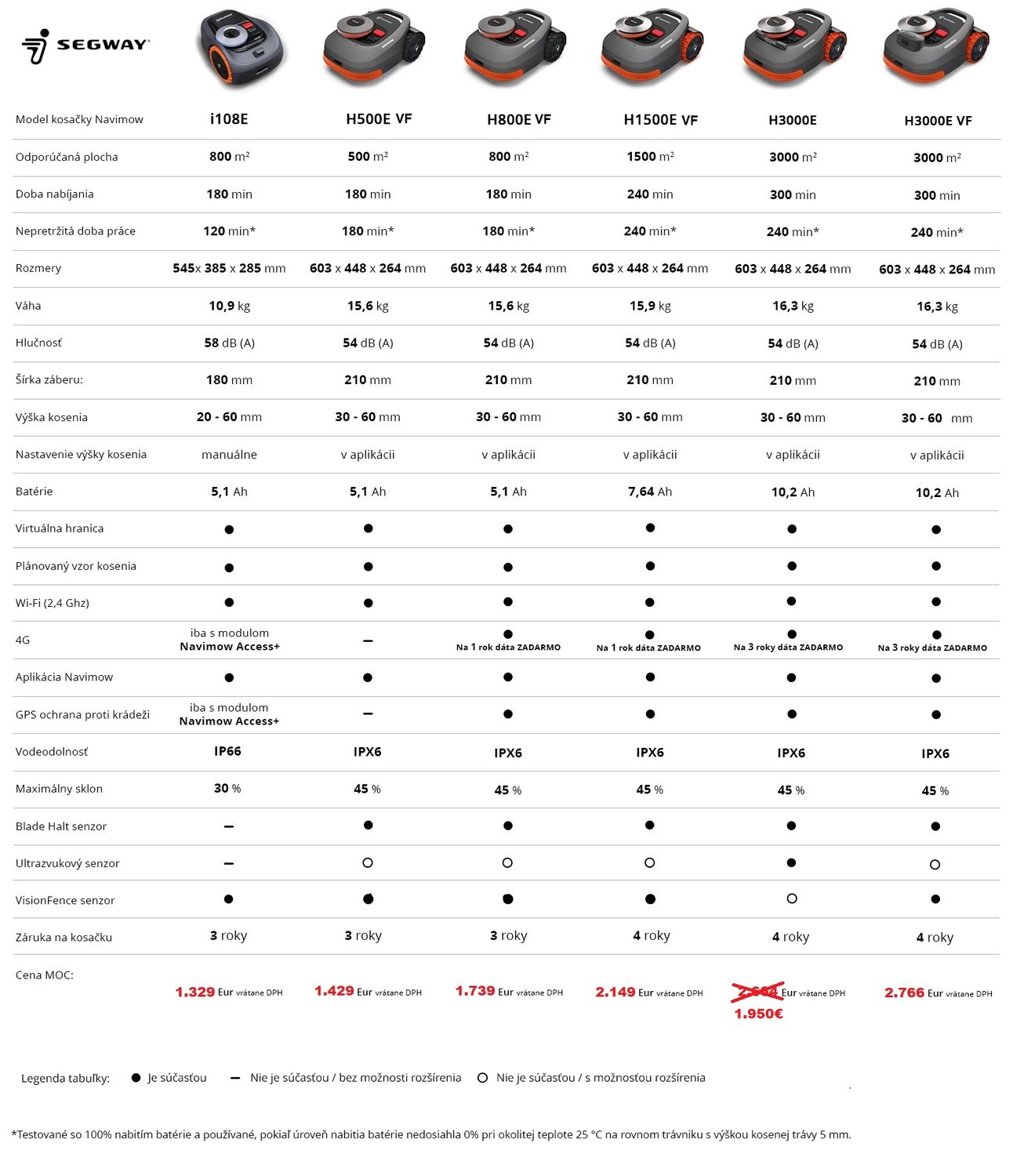 Doba nabíjania, hodinový výkon a efektivita práce sa pri jednotlivých modeloch líšia. Podľa nasledujúcej tabuľky si vyberte vhodný model podľa veľkosti vášho trávnika.