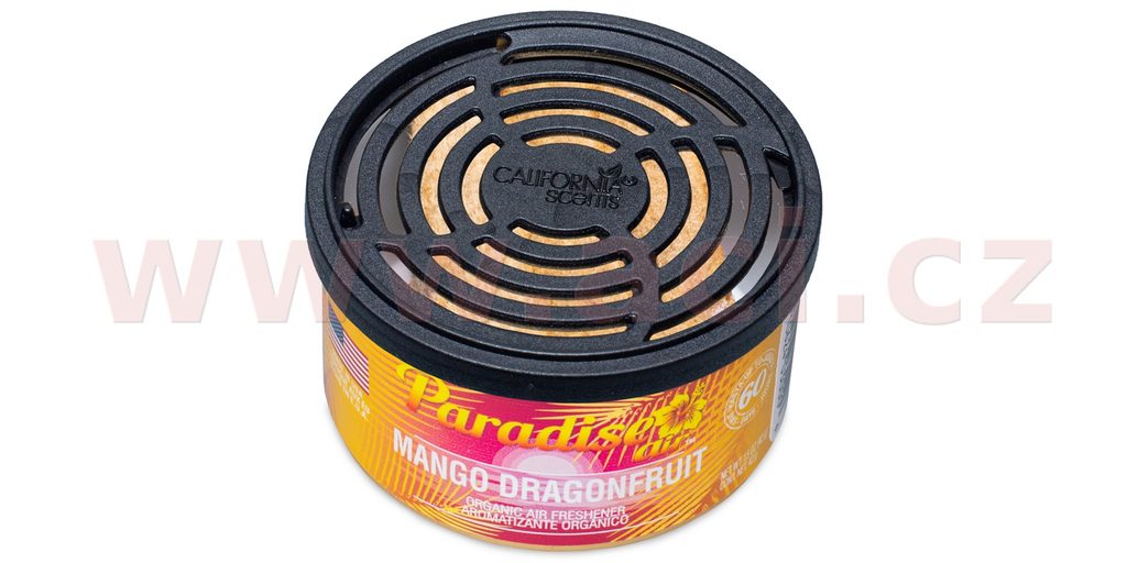 Každá plechovka vůně Paradise Air Organic obsahuje tři bloky lisovaného lnu napuštěného parfémem. Vzhledem k pevné konzistenci osvěžovače Paradise Air také nehrozí – jako u obdobných produktů tvořených nádobkou s parfémem – únik tekutiny následovaný nepříjemným poleptáním interiérových plastů automobilu.