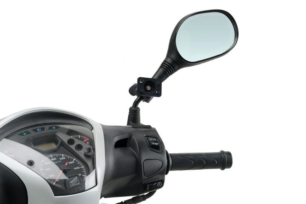 Černý adaptér na držák pro telefon, který se umisťuje na tyč zpětného zrcátka. Držák se pak montuje přímo na tento adaptér.