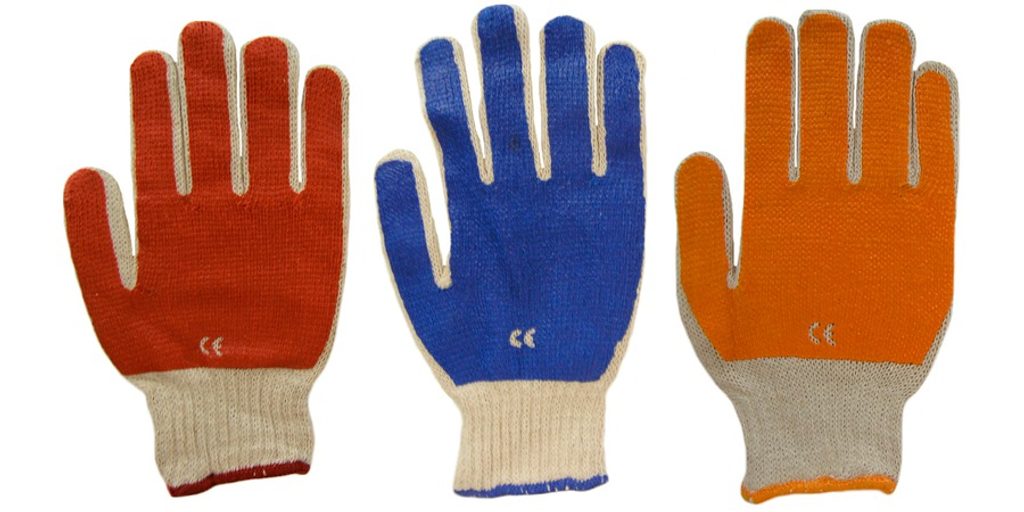 Pletené bezešvé bavlněné různobarevné rukavice, polomáčené v barevném PVC v dlani a na prstech, s pružnou manžetou.