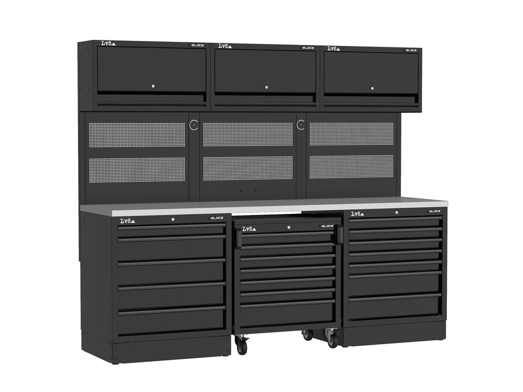Pracovní stůl délky 2400 mm s 5 zásuvkovou skříňkou, 7 zásuvkovým pojízdným vozíkem na nářadí a 7 zásuvkovou skříňkou. Masivní dřevěná pracovní deska, tři perforované panely pro zavěšení nářadí, nástěnné skříňky a příprava pro elektrickou zásuvku. K dispozici také ve variantě s nerezovou nebo melaminovou deskou.
