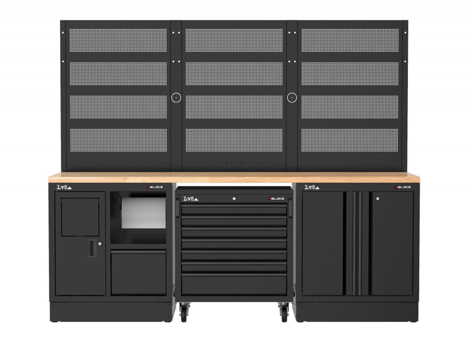 Pracovní stůl délky 2400 mm se servisní skříňkou (držák na papír a úložná zásuvka), 7 zásuvkovým pojízdným vozíkem a dvoudveřovou skříňkou s nastavitelnou policí a zámkem. Masivní dřevěná pracovní deska, tři perforované panely na nářadí a příprava pro elektrickou zásuvku. K dispozici také ve variantě s nerezovou nebo melaminovou deskou.