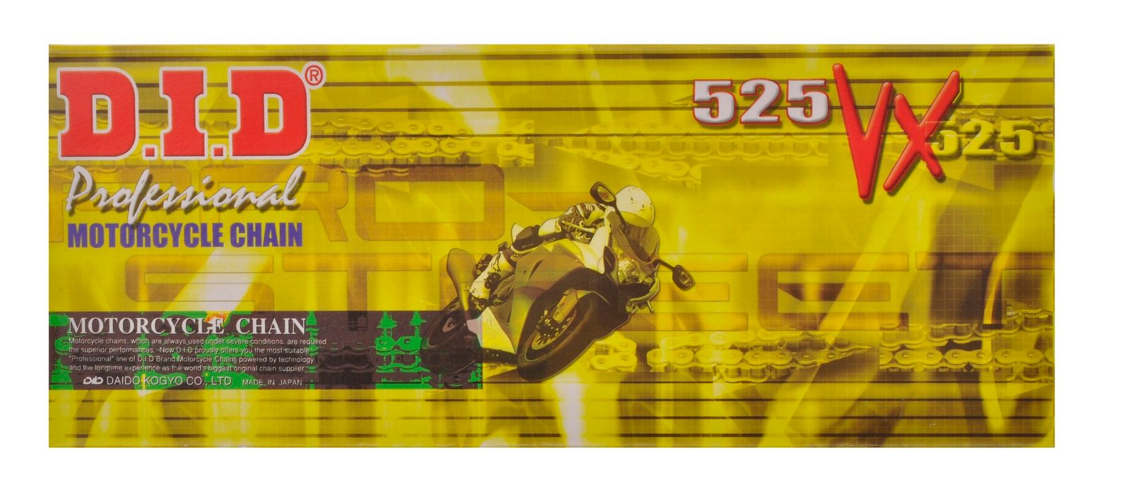 Popis: 525 VX je x-kroužkový řetěz pro silniční motocykly