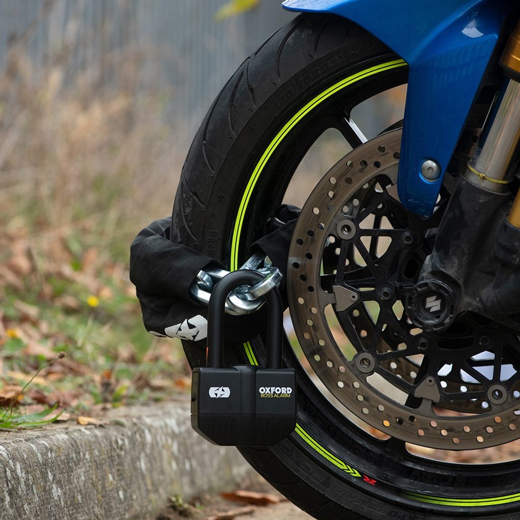 - nesilnější zámek s alarmem ze sortimentu Oxford v kombinaci s řetěžem o průřezu oka řetězu 12 mm