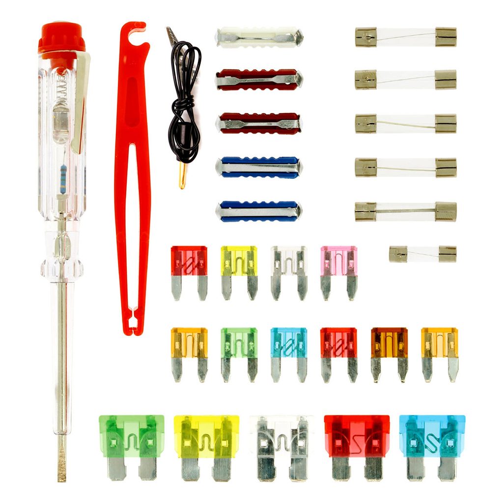 Sada obsahuje nejběžnější pojistky se zkoušečkou napětí v rozsahu 6-24 V a pinzetou.