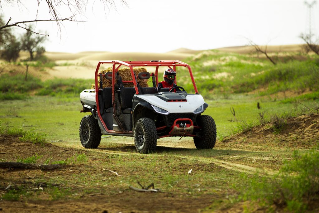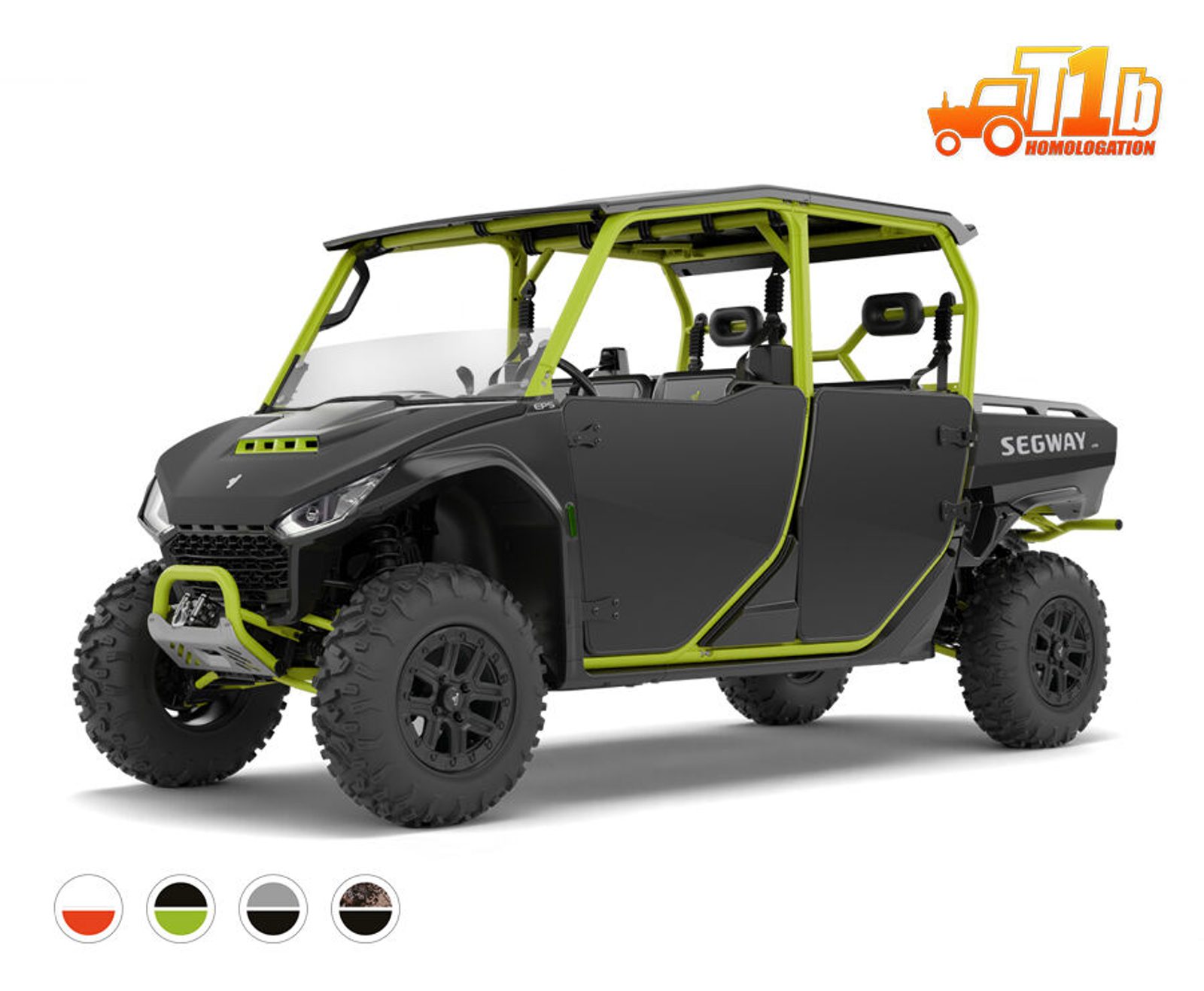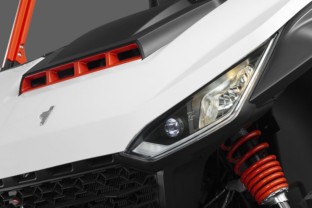 Elektrický navijak 4500 lbs, inteligentný elektrický posilňovač riadenia, TFT digitálna prístrojová doska, 10,4" dotyková obrazovka Smart Commanding Screen (SCS), ťažné zariadenie, nastaviteľný volant, anatomicky tvarované sedadlá s hlavovými opierkami, trojbodové pásy, predný a zadný ochranný rám, pevné bočné dvere, pevná strecha, veľká sklopná korba, 14" hliníkové disky so systémom Beadlock, 27" pneumatiky, predné ochranné plexi. |