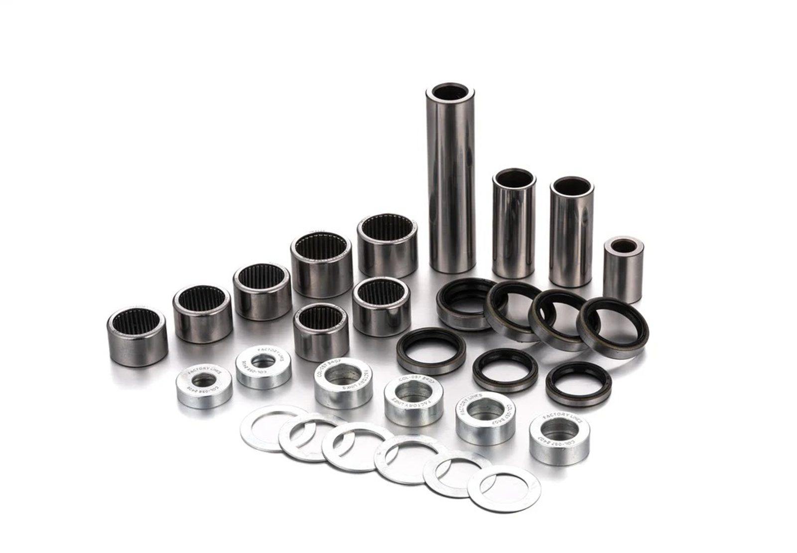 • Sady Factory Links vždy obsahují konkrétní komponenty (čepy, ložiska, pouzdra, příložky, podložky, rozpěrky, simeringy, kloubová ložiska, jehlová ložiska) pro konkrétní motocykly (detaily v zařazení).