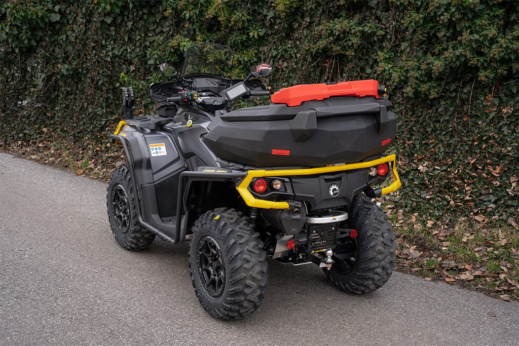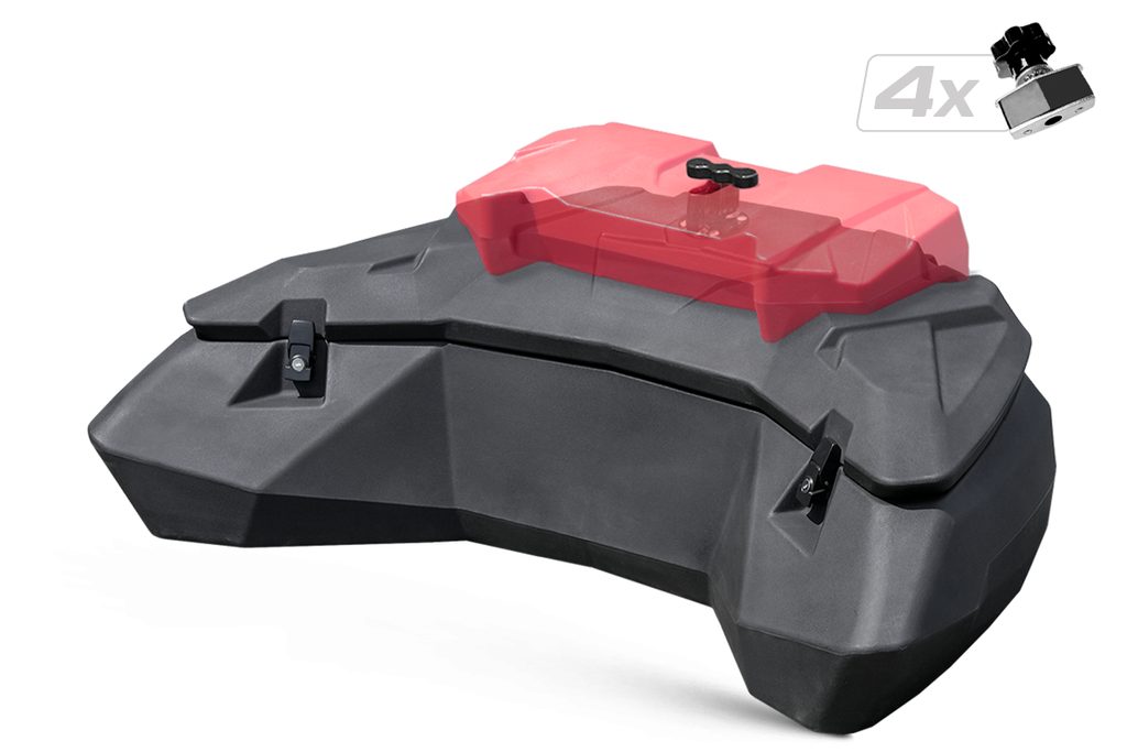 Prostorný uzamykatelný zadní box na čtyřkolku, objem 130 litrů, těsnění proti vnikání vody, zamykání na dvě kovové přezky, rychloupínací sada součástí balení