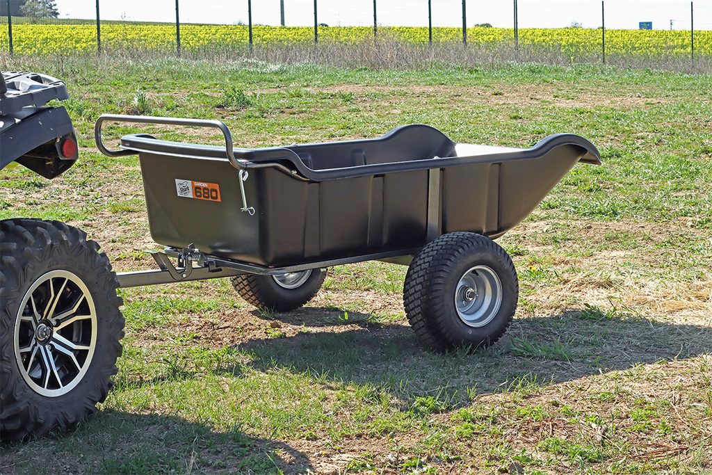 Praktický lehký sklápěcí ATV vozík s velkou plastovou korbou, vysoká nosnost 680 kg, robustní práškově lakovaná konstrukce, hmotnost 54.5 kg, rozměry 175.5 x 101 x 45.5 cm, široké nízkotlaké 18" pneumatiky šetrné k povrchu