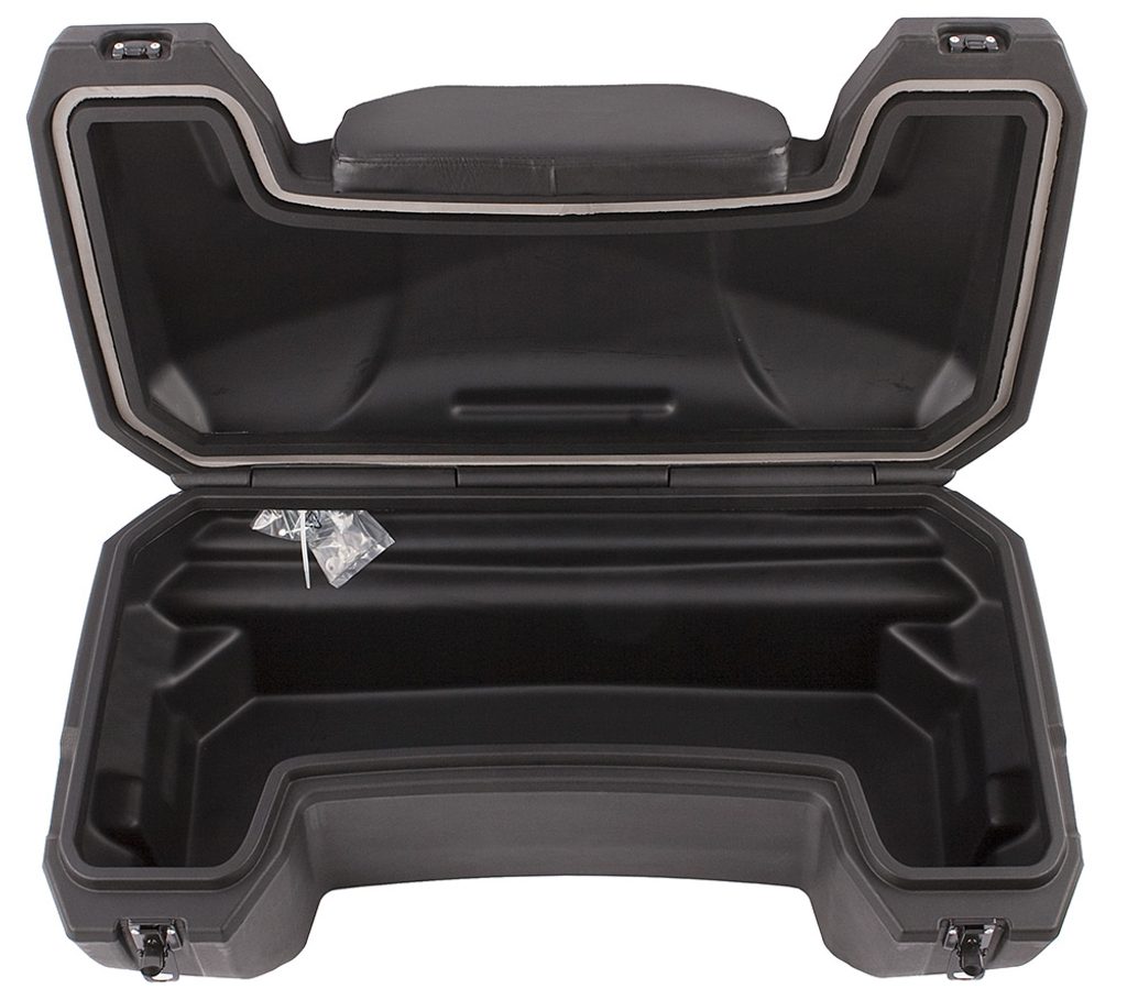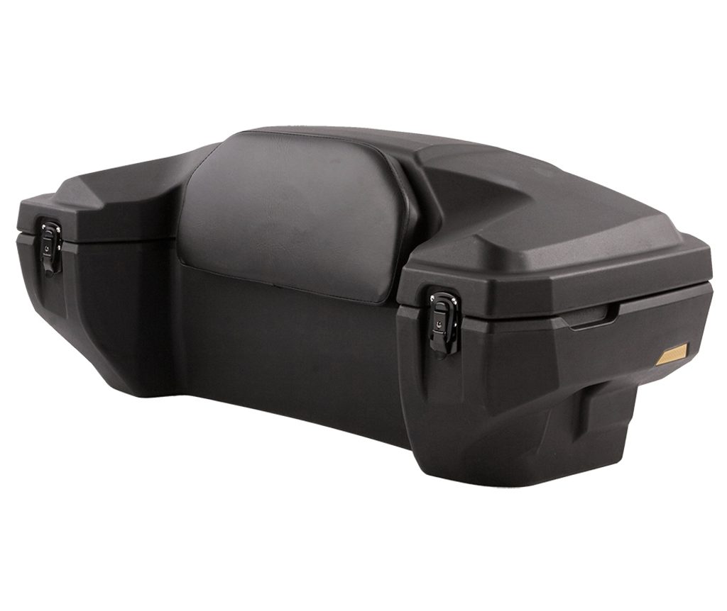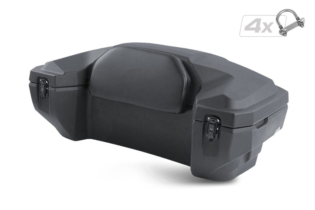 Velký uzamykatelný zadní box na čtyřkolku, objem 81 litrů, zamykání na dvě uzamykatelné západky, těsnění proti vnikání vody, pohodlná čalouněná opěrka zad, dvě zadní odrazky, rozměry 98 x 43 x 55 (41) cm (D x Š x V)