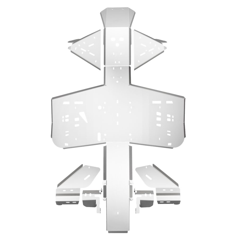 Kompletní kryty podvozku Shark Accessories, odolná ochrana spodní části čtyřkolky, z anodizovaného a lehkého 4mm hliníku letecké kvality, montážní otvory pro snadnou údržbu, výřezy pro snadnější čištění čtyřkolky, včetně integrovaných krytů nášlapů, nízká hmotnost, snadná montáž