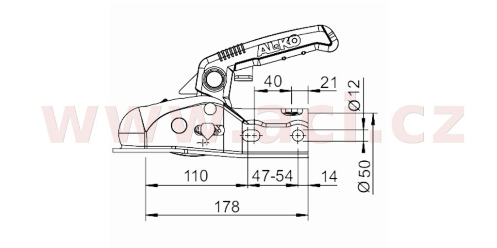 Tažná kulová spojka (přípojný kloub) AL-KO AK 161 nahrazuje starší typ AK 160. Je určená pro montáž na nájezdové brzdy do 1600 kg s průměrem tažné trubky 50 mm a vrtáním pro horizontálně umístěné upevňovací šrouby. Díky přiloženým distančním vložkám je možné ji namontovat rovněž na tažnou trubku o průměru 45 nebo 35 mm Spojka se běžně upevňuje dvěma horizontálně umístěnými šrouby (nejsou součástí dodávky, na přání dodáváme samostatně). V zadní části tažné spojky je také otvor pro vertikálně umístěný šroub, který umožňuje použít tažnou spojku i na nájezdových brzdách s upevňovacími šrouby umístěnými "do kříže".