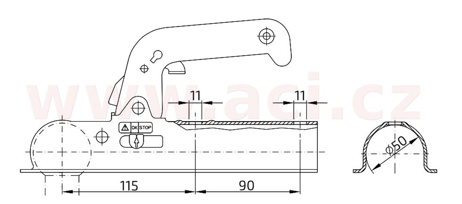 Standardní tažná spojka 800 kg pro nebrzděné přívěsy. Určená pro montáž na trubku průměr 50 mm. Je vybavena praktickým držákem sedmipólové zástrčky. Ovládací madlo je opatřeno stiskací pojistkou a otvorem pro zámek 9907655Q.