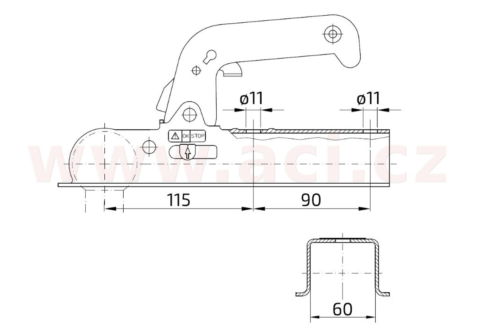 Standardní tažná spojka 800 kg pro nebrzděné přívěsy. Určená pro montáž na čtyřhan šíře 60 mm. Je vybavena praktickým držákem sedmipólové zástrčky. Ovládací madlo je opatřeno stiskací pojistkou a otvorem pro zámek WW DBS 8/AK7.