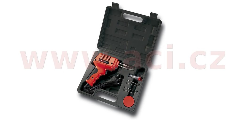 Pistolová transformátorová pájka 100 W pro všestranné použití v elektrotechnice a dílně. Klasické provedení se žárovkou na osvětlení pracovní plochy.